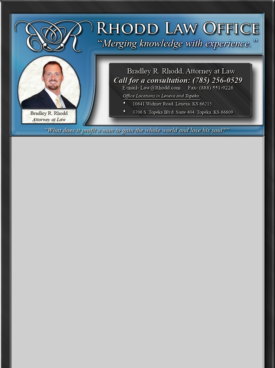 Get the professionalism and client service you deserve. Call today to schedule a consultation. Contact Bradley Rhodd, Attorney at Law. Telephone- (785) 256-0529 Fax- (888) 551-9226 e-mail- law@rhodd.com
